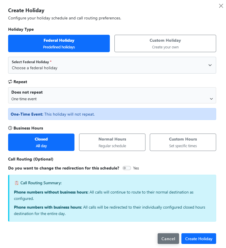 7. Next, select the business hours. You can select from Closed, Normal Hours or Custom Hours. If you select Closed, calls during the Holiday being created will route to the normal after hours destination. If Normal Hours is selected, calls will route as they would during normal business hours.