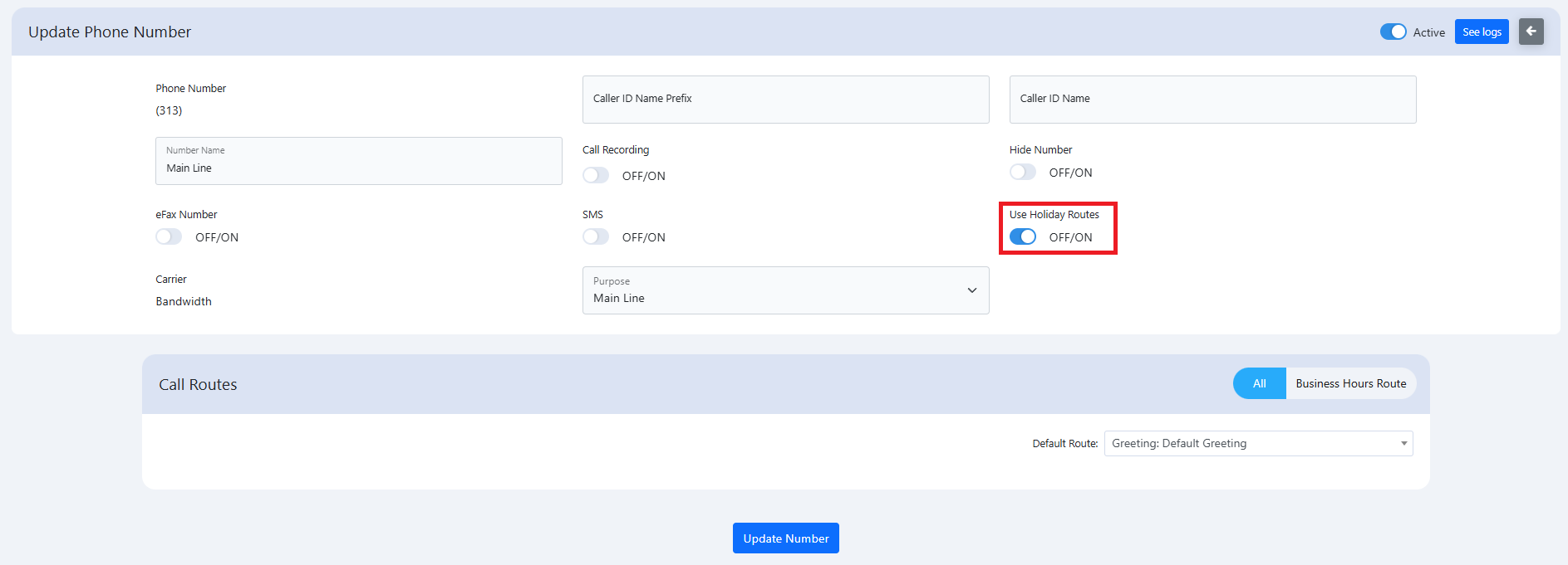8. On the number edit page, ensure the Use Holiday Routes slide bar option is enabled. Then, select the Update Number button to submit the changes.