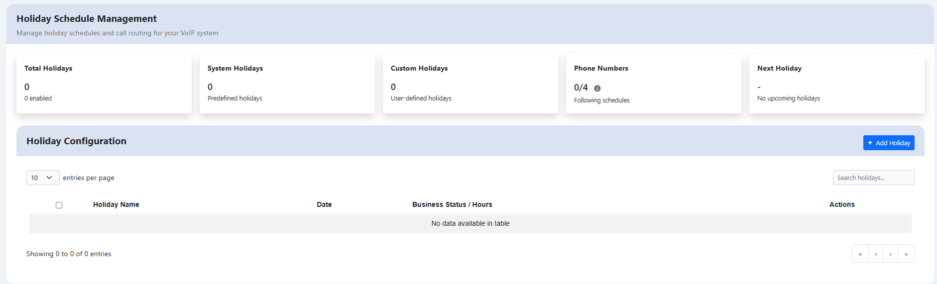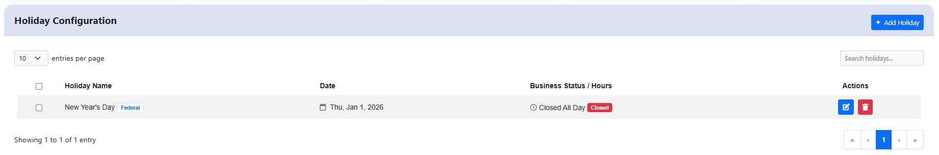 2. You will be brought to the following page. On this page, an overview of all Holiday configurations is listed. You also have an option to create or edit an existing holiday configuration.