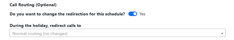 8. After the hours are entered, you have the option to change the redirection of calls for this specific holiday schedule. If you wish to adjust this setting, simply press the Yes slidebar option to enable it. Then, select the route you wish calls to route to during this holiday.